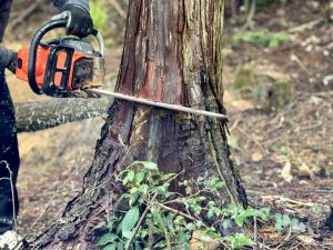 自分で伐採する場合は、周囲の安全確認、倒す方向を制御する切り方、防護具の着用などを忘れないでください。